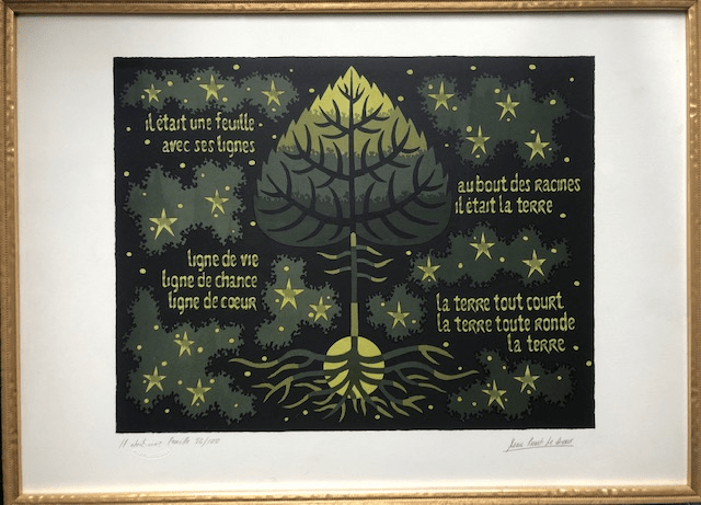 La lithographie représentée ici se trouve dans le bureau du parfumeur. En plus de la symbolique végétale et du camaïeu de couleurs onirique, l’artiste, comme souvent dans ses œuvres, a intégré du texte, ici une poésie de Robert Desnos :