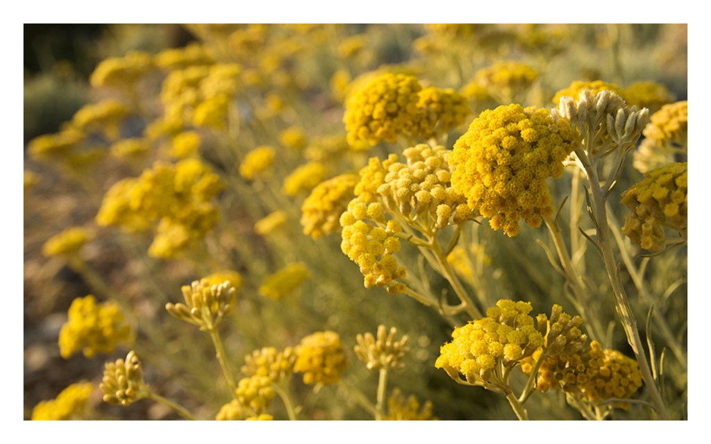 L’immortelle, arbuste de la famille des Astéracées, est une espèce endémique du bassin méditerranéen. Emblématique du maquis corse, c’est une plante herbacée, vivace, et très aromatique. Son odeur puissante, miellée, tabacée, agreste, liquoreuse, est également légèrement épicée et peut rappeler celle du curry. Les deux variétés les plus utilisées en parfumerie sont l’Helichrysum stoechas de Provence, et l’Helichrysum angustifolium que l’on trouve en Italie, Espagne, Maghreb ou encore en Albanie.