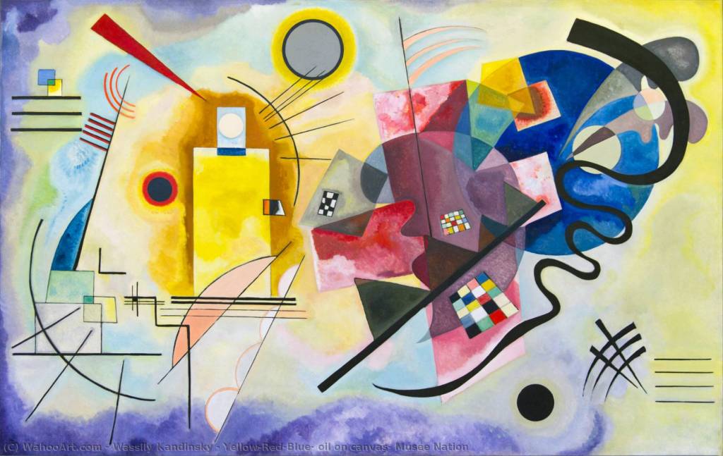 Plutôt réaliste dans ses premières réalisations, Kandinsky arrive à l’abstraction plutôt vers la fin de sa carrière, période à laquelle il va créer majoritairement avec ses trois formes primaires et ses trois couleurs primaires.