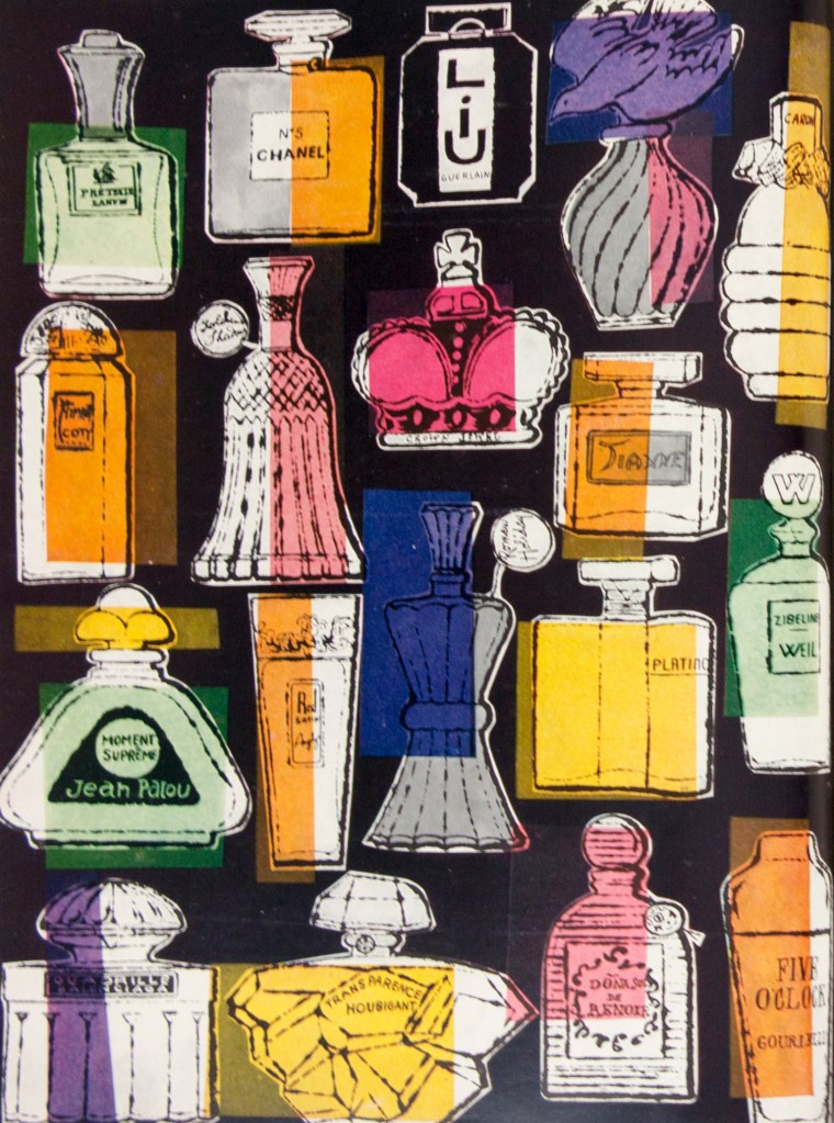Outre ses sujets favoris, reflets de la société de consommation américaine, tels que le deviendront les bouteilles de Coca Cola ou les boîtes de soupe Campbell’s, Warhol voue une passion au parfum. Passant d’un parfum à l’autre tous les trois mois, il était aussi collectionneur de flacons et fasciné par le pouvoir de la mémoire olfactive.